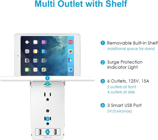 Socket Outlet Shelf with USB Ports, 1020J Surge Protector Extender Removable Charging Shelf, Wall Bathroom Multi Adapter Plug, FCC Listed.